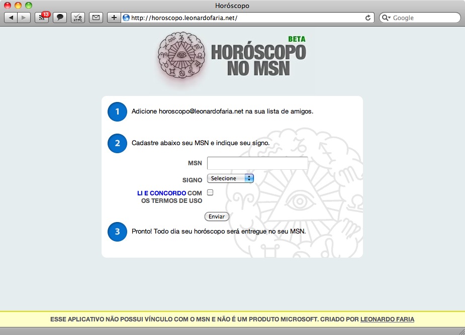 Funciona assim: você adiciona na sua lista de AmIgUxOs o contato horoscopo@leonardofaria.net. Vai no site e escolhe o signo que deseja ser informado. Pronto. Uma vez por dia, o robozinho da aplicação vai entregar no seu MSN o seu horóscopo.