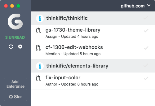 Gitify is an app on the menubar that brings Github notifications. I know, there are email notifications or Chrome extensions but what I like in Gitify: it just works. New notification: icon color change in the menubar.