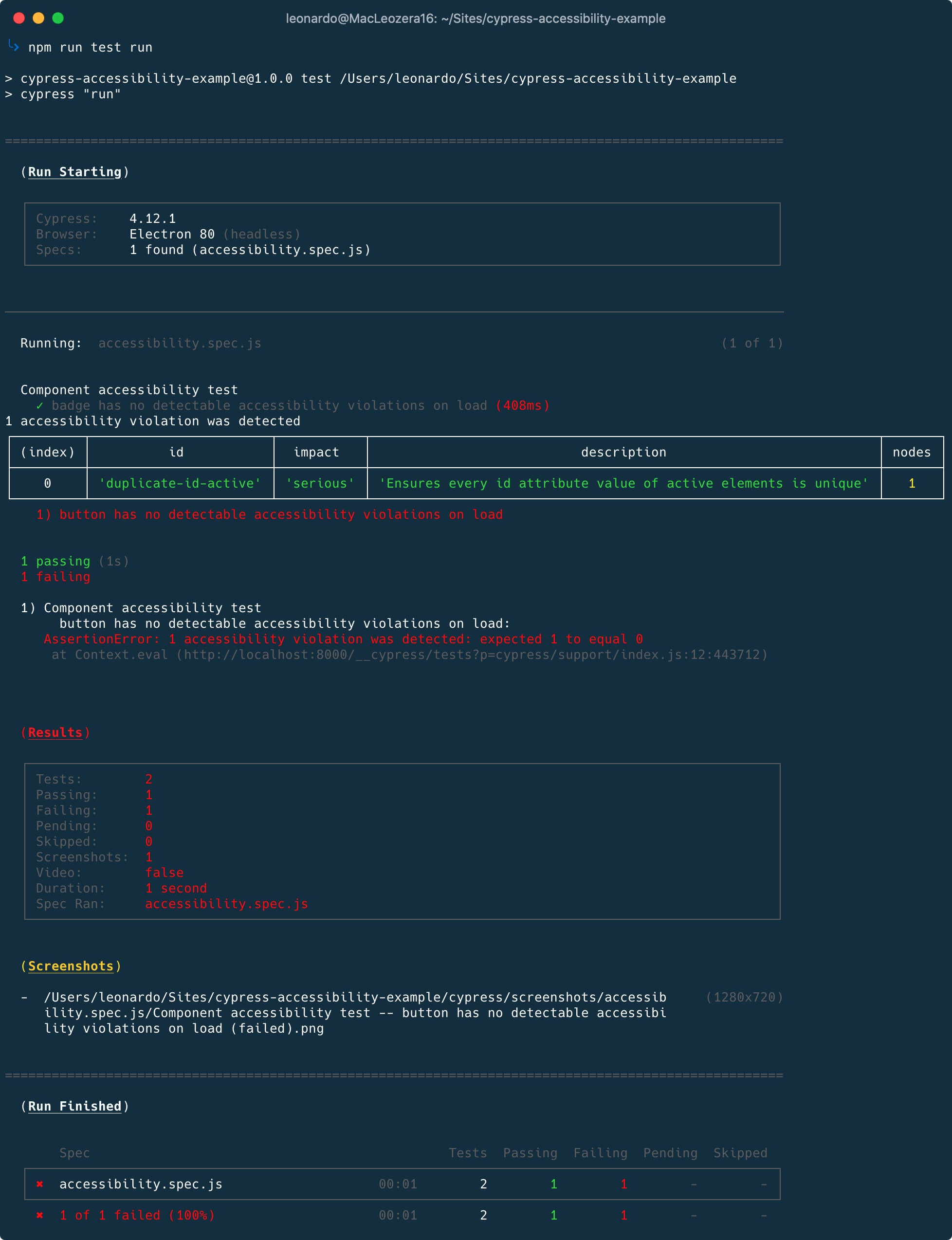 );When you run the test again, you'll a table containing the issues reported by axe: